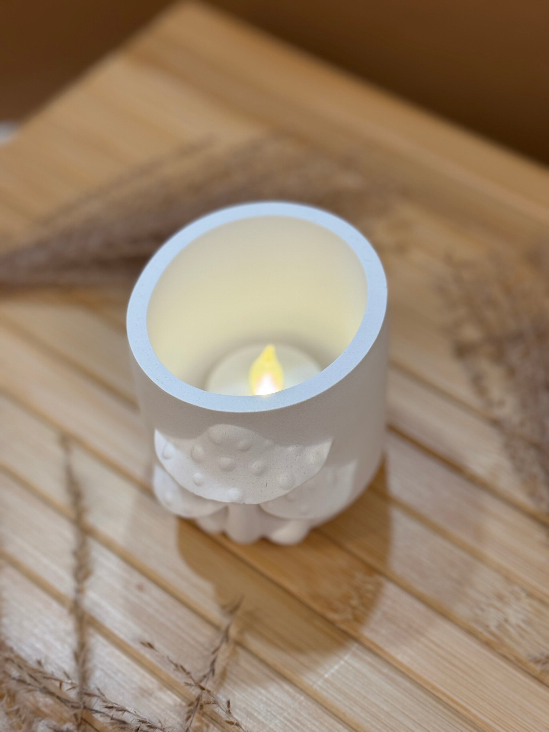 Der Kerzenhalter eignet sich ideal für Teelichter oder kleine LED-Kerzen und sorgt für ein warmes, angenehmes Licht. Durch die glatte, mattweiße Oberfläche wirkt er modern und gleichzeitig verspielt.