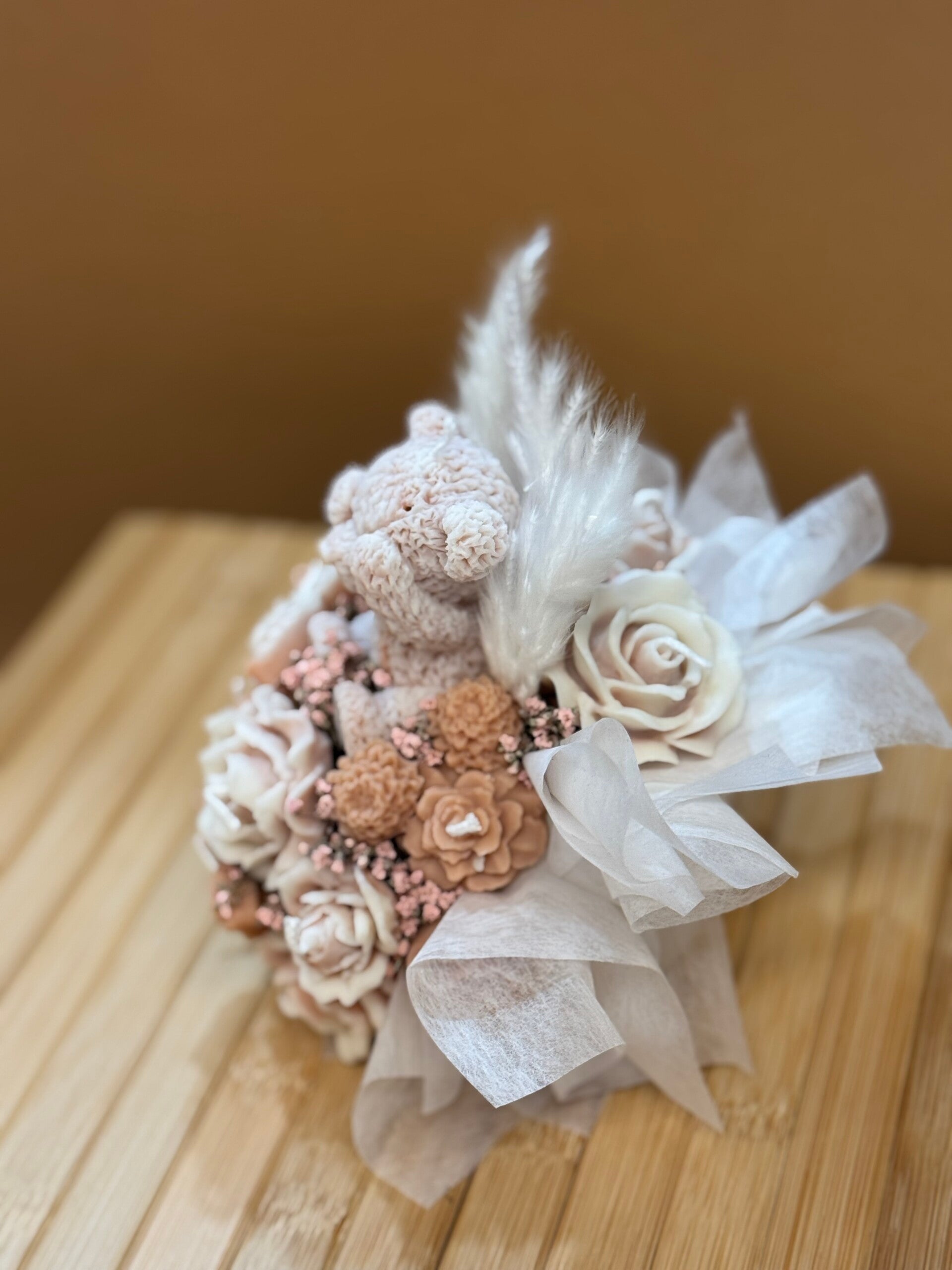 Die Kerze besteht aus hochwertigem, nachhaltigem Rapswachs und wurde vollständig von Hand gegossen und modelliert. Die zarten Blüten, der niedliche Bär und die feinen Details machen dieses Kunstwerk zu einem besonderen Blickfang in jedem Raum.