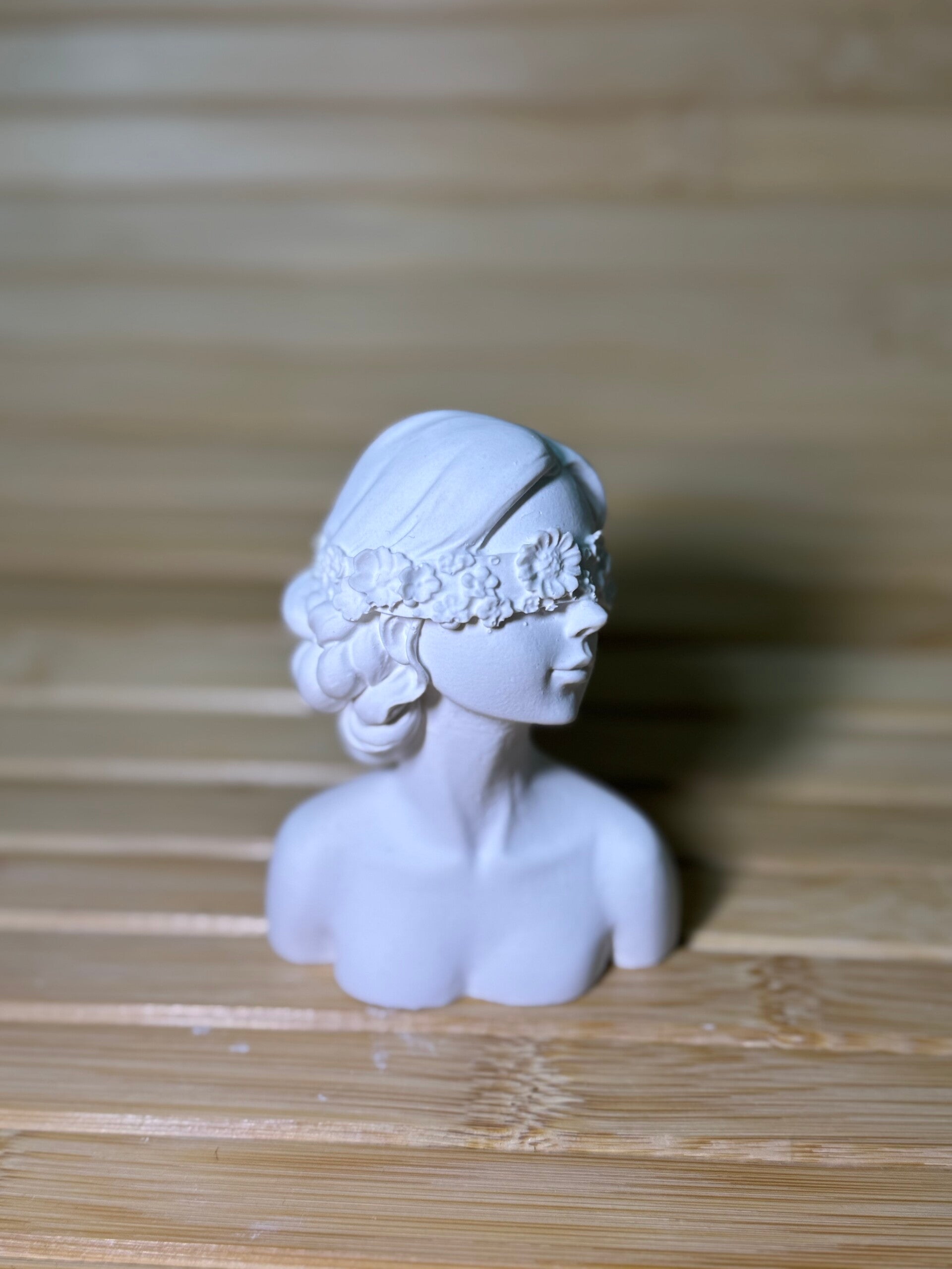 Diese handgemachte Dekofigur zeigt den Oberkörper einer eleganten Frau, deren Augen liebevoll mit einer zarten Blumen-Augenbinde verziert sind. Die weichen Linien, die feinen Gesichtszüge und die detaillierten Blüten machen dieses Stück zu etwas ganz Besonderem.